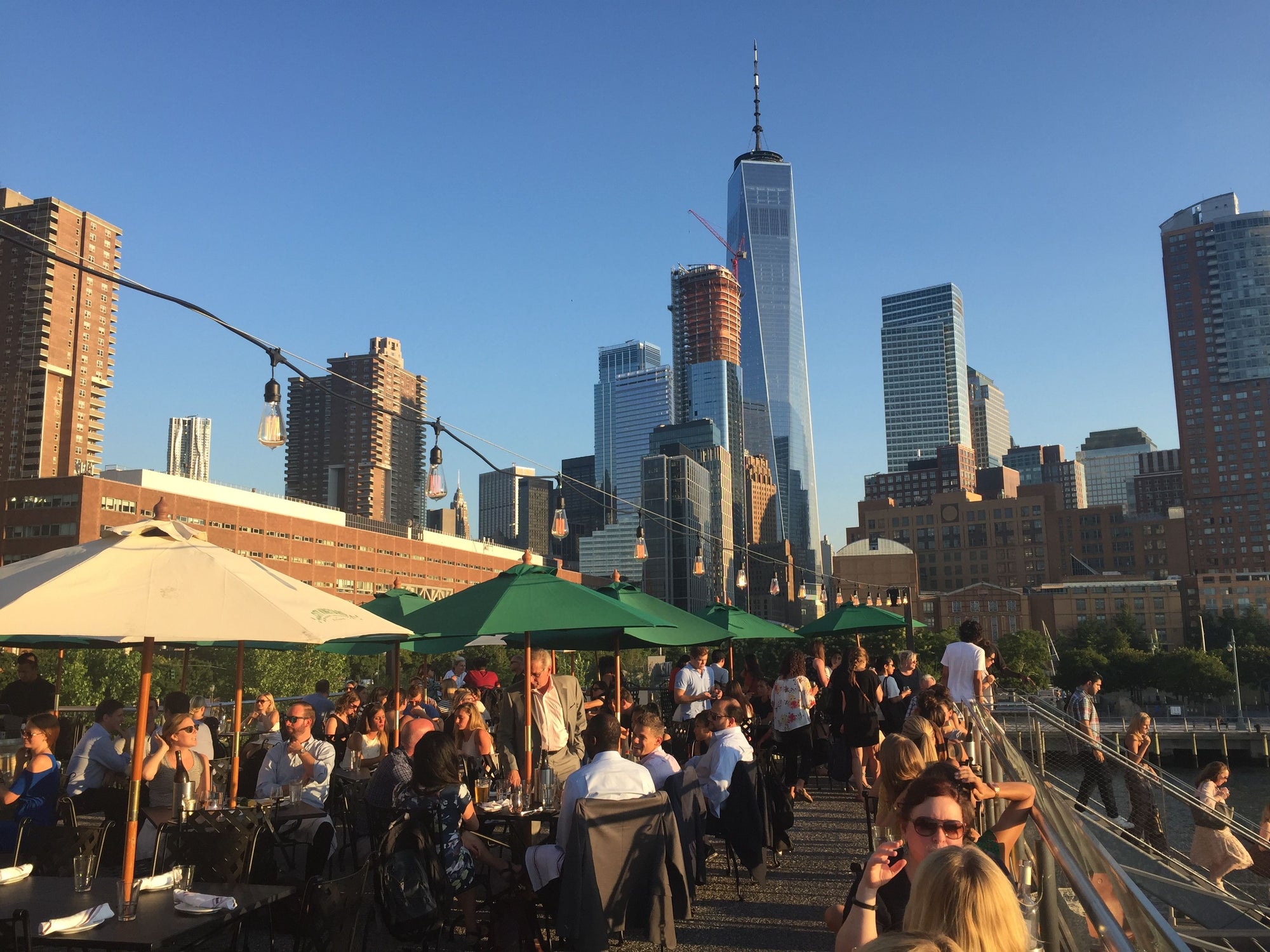- This open air lounge has stunning views of downtown and the Hudson River and Freedom Tower